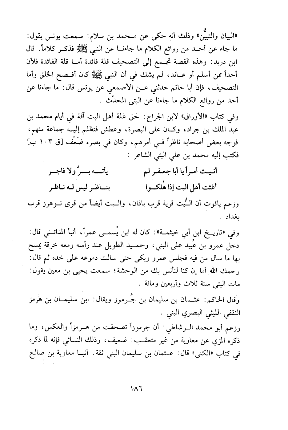" البيان والتبين"، وذلك أنه حكى عن محمد بن سلام: سمعت يونس يقول: ما جاء عن أحد من روائع الكلام ما جاءنا عن النبي صَلى الله عَليه وسَلم فذكر كلاما. قال ابن دريد: وهذه القصة تجمع إلى التصحيف قلة فائدة، أما قلة الفائدة فلأن أحدا ممن أسلم أو عاند، لم يشك في أن النبي صَلى الله عَليه وسَلم كان أفصح الخلق وأما التصحيف، فإن أبا حاتم حدثني عن الأصمعي عن يونس قال: ما جاءنا عن أحد من روائع الكلام ما جاءنا عن البتي المحدث.