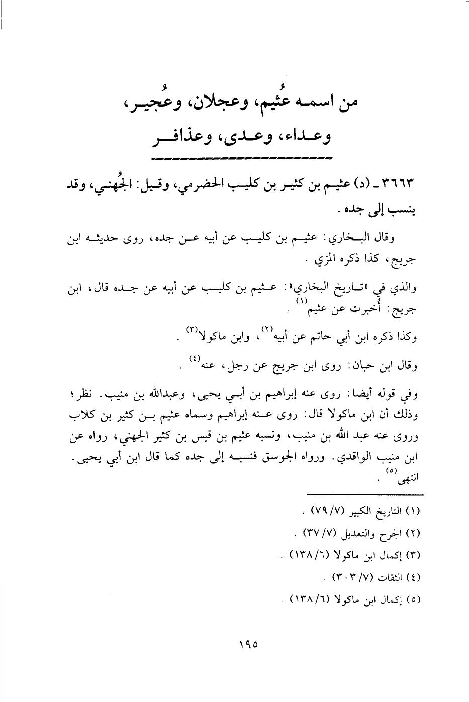 3663 - (د) عثيم بن كثير بن كليب الحضرمي، وقيل: الجهني، وقد ينسب إلى جده.