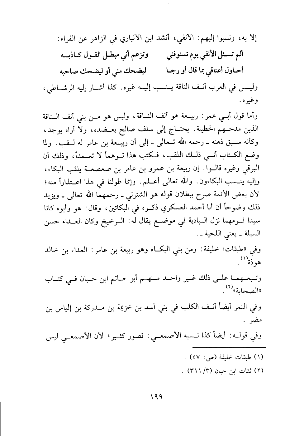 وأما قول أبي عمر: ربيعة هو أنف الناقة، وليس هو من بني أنف الناقة الذين مدحهم الحطيئة. يحتاج إلى سلف صالح يعضده، ولا أراه يوجد، وكأنه سبق ذهنه رحمه الله تعالى إلى أن ربيعة بن عامر له لقب، ولما وضع الكتاب أنسي ذلك اللقب، فكتب هذا توهما لا تعمدا، وذلك أن البرقي وغيره قالوا: إن ربيعة بن عَمرو بن عامر بن صعصعة يلقب البكاء، وإليه ينسب البكاءون، والله تعالى أعلم، وإنما طولنا في هذا اعتذارا منه؛ لأن بعض الأئمة صرح ببطلان قوله هو الشترني رحمهما الله تعالى ويزيد ذلك وضوحا أن أبا أحمد العسكري ذكره في البكائين، وقال: هو وأبوه، كانا سيدا قومهما نزل البادية في موضع يقال له: الرخيخ، وكان العداء حسن السبلة، يعني اللحية.