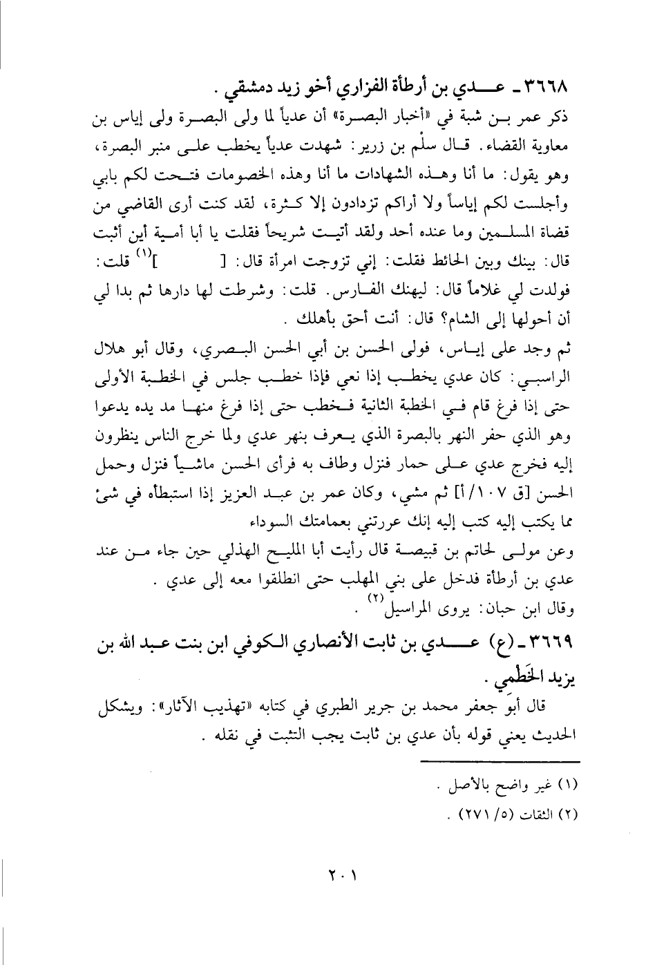 3669- (ع) عدي بن ثابت الأنصاري الكوفي ابن بنت عبد الله بن يزيد الخطمي.