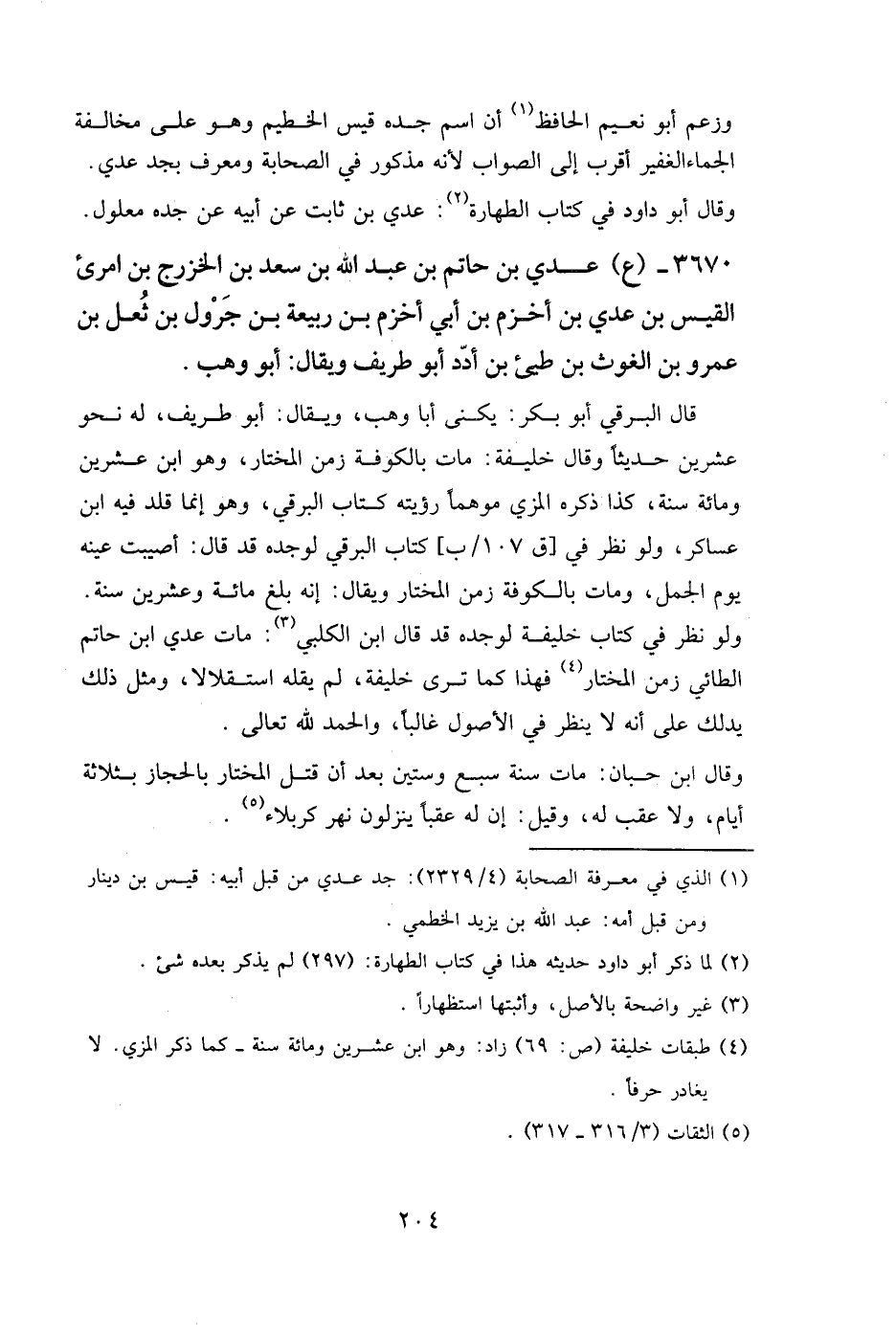 ولو نظر في كتاب خليفة لوجده قد قال ابن الكلبي: مات عدي بن حاتم الطائي زمن المختار، فهذا كما ترى خليفة، لم يقله استقلالا، ومثل ذلك يدلك على أنه لا ينظر في الأصول غالبا، والحمد لله تعالى.