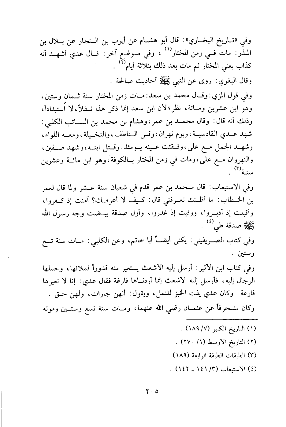 وفي قول المزي: وقال محمد بن سعد: مات زمن المختار سنة ثمان وستين، وهو ابن عشرين ومِائَة، نظر؛ لأن ابن سعد إنما ذكر هذا نقلا، لا استبدادا، وذلك أنه قال: وقال محمد بن عمر، وهشام بن محمد بن السائب الكلبي: شهد عدي القادسية، ويوم نهران، وقس الناطف، والنخيلة، ومعه اللواء، وشهد الجمل مع علي، وفقئت عينه يومئذ، وقتل ابنه، وشهد صفين والنهروان مع علي، ومات في زمن المختار بالكوفة، وهو ابن مِئَة وعشرين سنة.