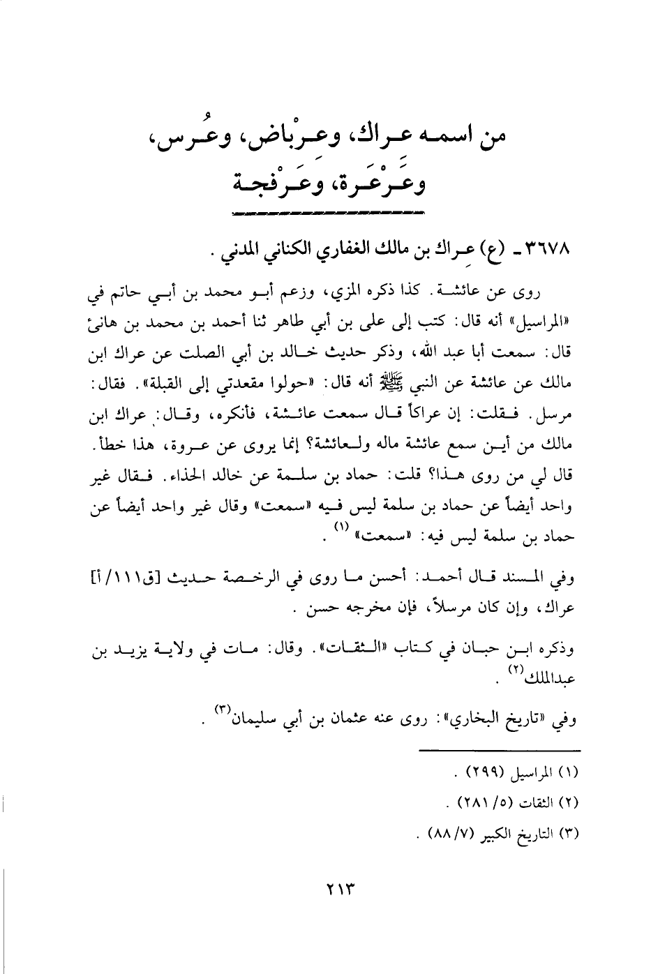 روى عن عائشة. كذا ذكره المزي، وزعم أبو محمد بن أبي حاتم في "المراسيل " أنه قال: كتب إلى علي بن أبي طاهر، حَدَّثنا أحمد بن محمد بن هانئ، قال: سمعت أبا عبد الله، وذكر حديث خالد بن أبي الصلت عن عراك بن مالك، عن عائشة عن النبي صَلى الله عَليه وسَلم أنه قال: حولوا مقعدتي إلى القبلة. فقال: مرسل. فقلت: إن عراكا قال: سمعت عائشة، فأنكره، وقال: عراك بن مالك من أين سمع عائشة، ما له ولعائشة؟ إنما يروي عن عروة، هذا خطأ.