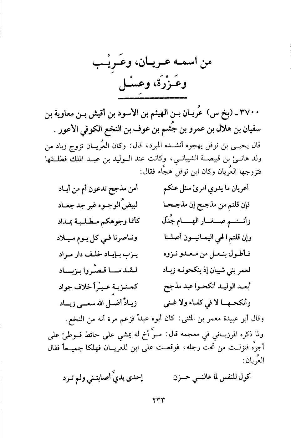 ولما ذكره المرزباني في معجمه قال: مر أخ له يمشي على حائط، فوطئ على أجره فنزلت من تحت رجله، فوقعت على ابن للعريان فهلكا جميعا فقال العريان: