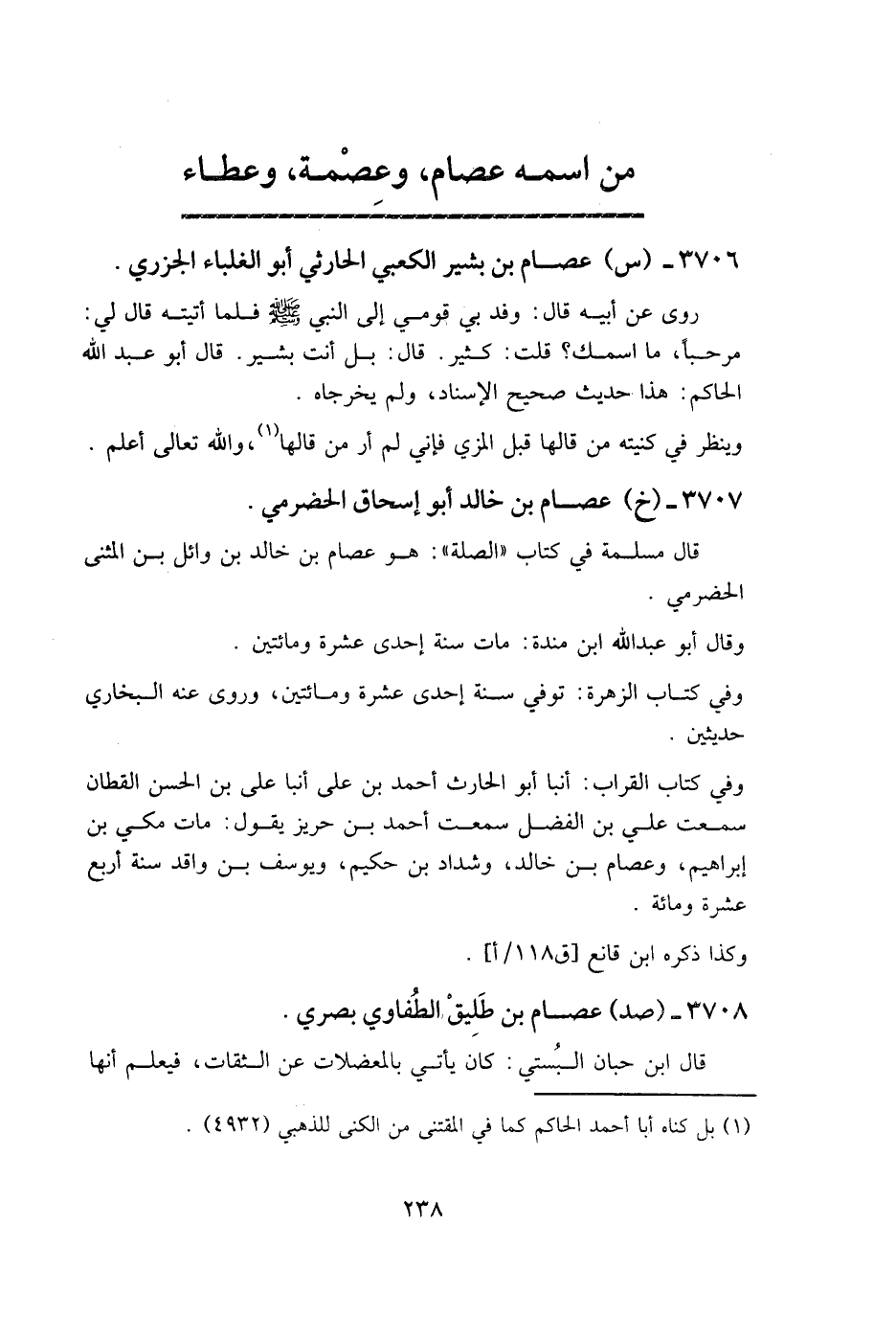 3706- (س) عصام بن بشير الكعبي الحارثي أبو الغلباء الجزري.