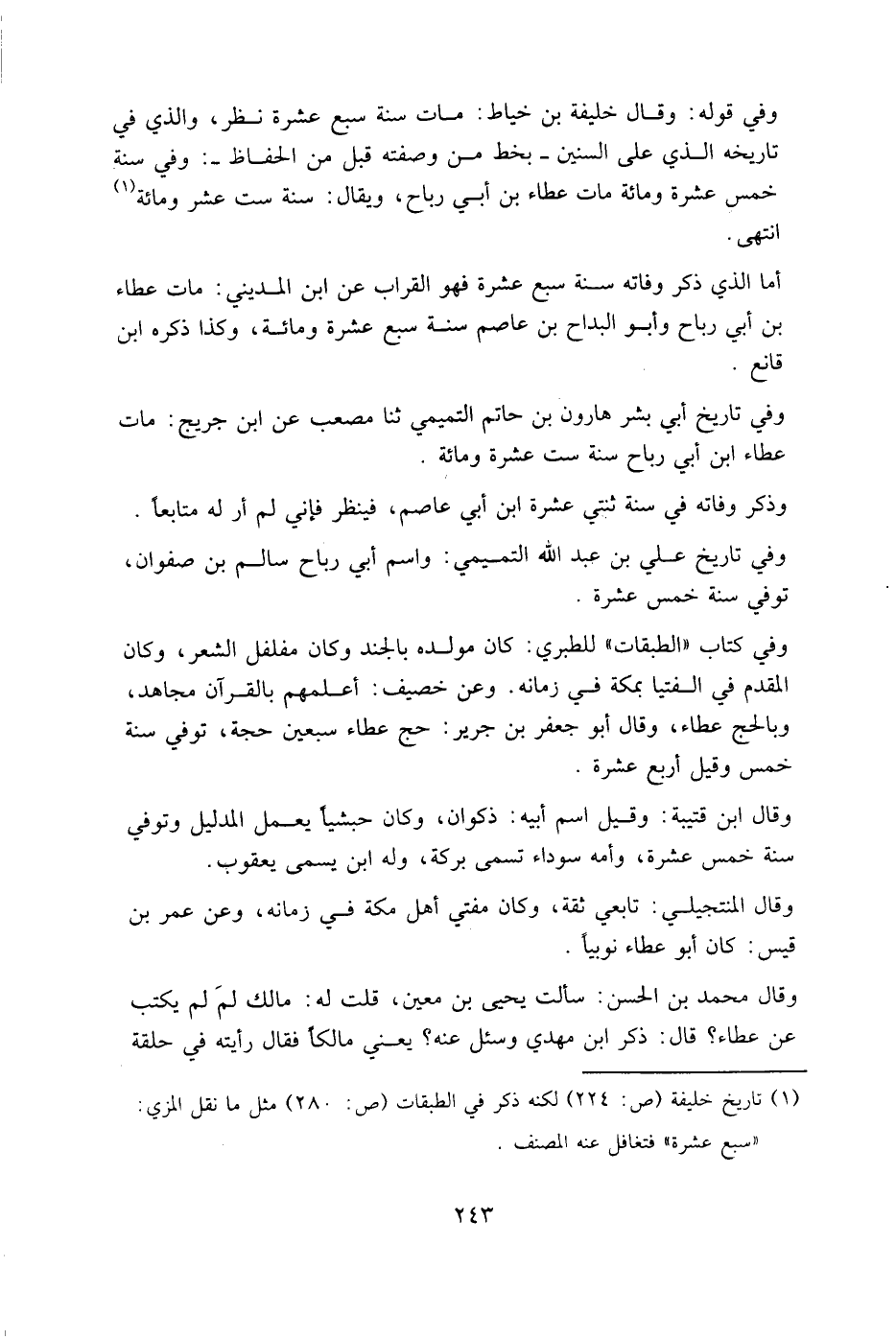 وفي قوله: وقال خليفة بن خياط: مات سنة سبع عشرة نظر، والذي في تاريخه الذي على السنين بخط من وصفته قبل من الحفاظ: وفي سنة خمس عشرة ومِائَة مات عطاء بن أبي رباح، ويقال: سنة ست عشر ومائَة، انتهى.
