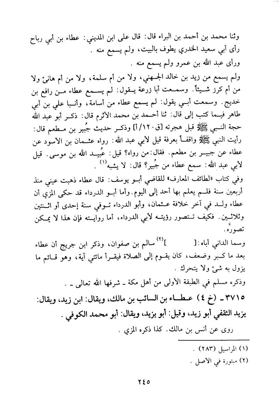 وحدثنا محمد بن أحمد بن البراء قال: قال علي بن المديني: عطاء بن أبي رباح رأى أبا سعيد الخدري يطوف بالبيت، ولم يسمع منه.