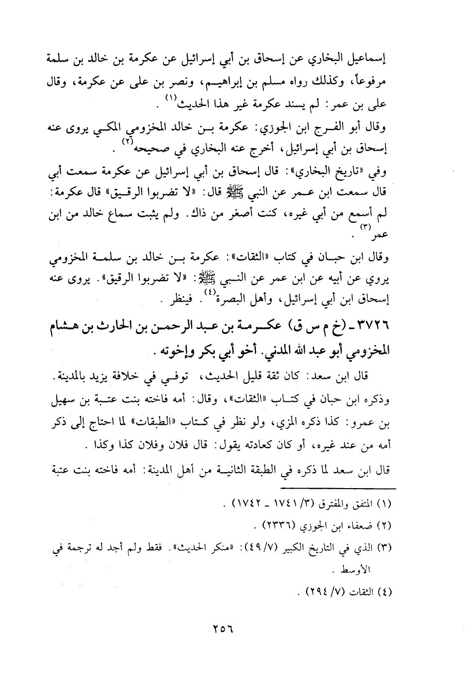 وقال ابن حبان في كتاب "الثقات": عكرمة بن خالد بن سلمة المخزومي يروي عن أبيه، عن ابن عمر، عن النبي صَلى الله عَليه وسَلم: لا تضربوا الرقيق.
