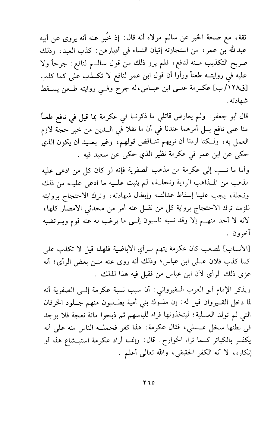 وأما ما نسب إلى عكرمة من مذهب الصفرية، فإنه لو كان كل من ادعى عليه مذهب من المذاهب الردية ونحلة، لم يثبت عليه ما ادعى عليه من ذلك ونحلة، يجب علينا إسقاط عدالته وإبطال شهادته، وترك الاحتجاج بروايته للزمنا ترك الاحتجاج برواية كل من نقل عنه أمر من محدثي الأمصار كلها؛ لأنه لا أحد منهم إلا وقد نسبه ناسبون إلى ما يرغب له عنه قوم ويرتضيه آخرون.
