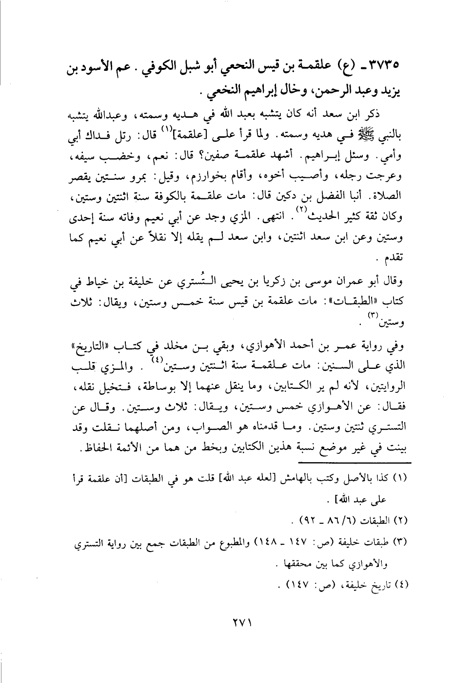 3735- (ع) علقمة بن قيس النخعي أبو شبل الكوفي. عم الأسود بن يزيد وعبد الرحمن، وخال إبراهيم النخعي.