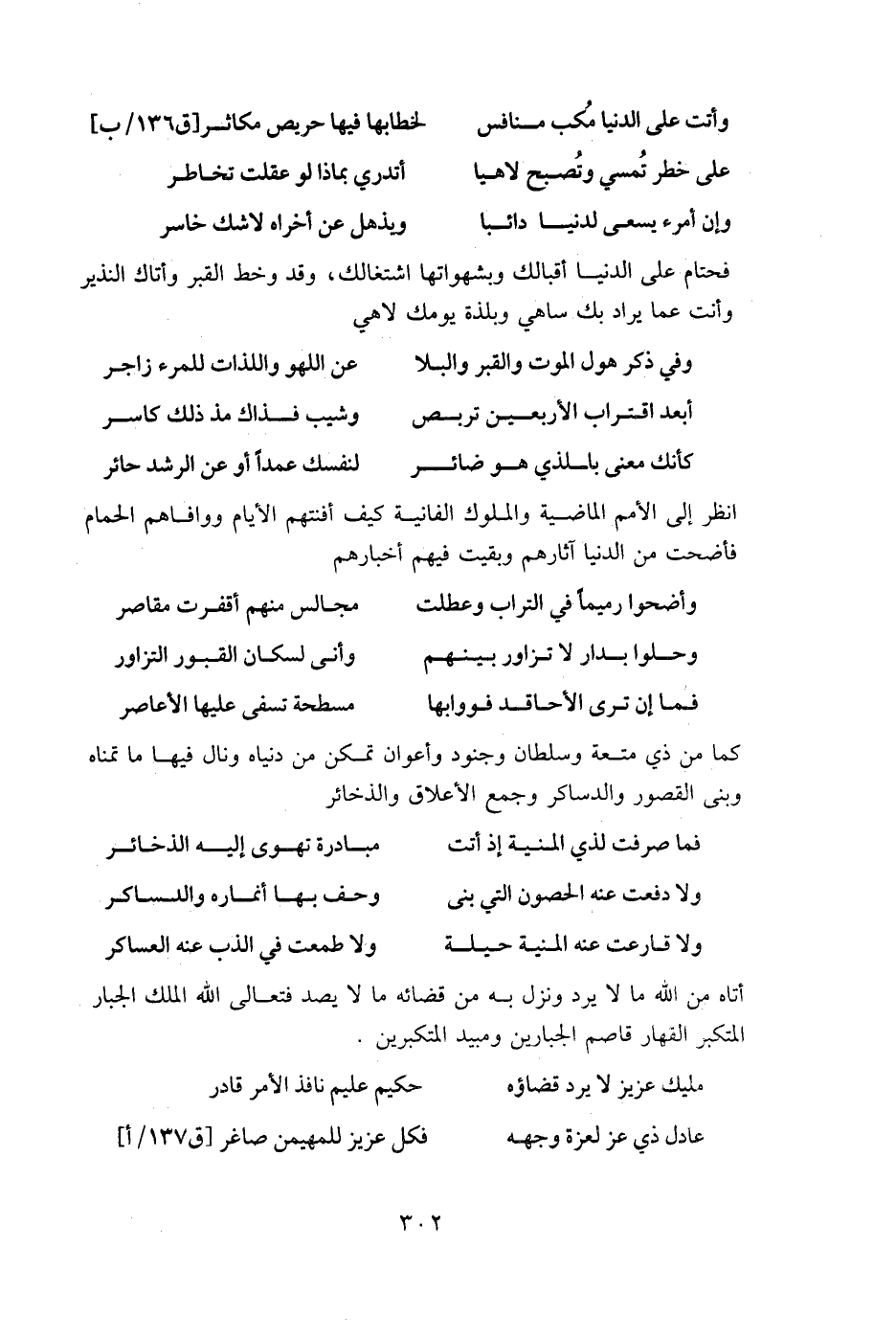 عادل ذي عز لعزة وجهه... فكل عزيز للمهيمن صاغر [ق 137/أ]