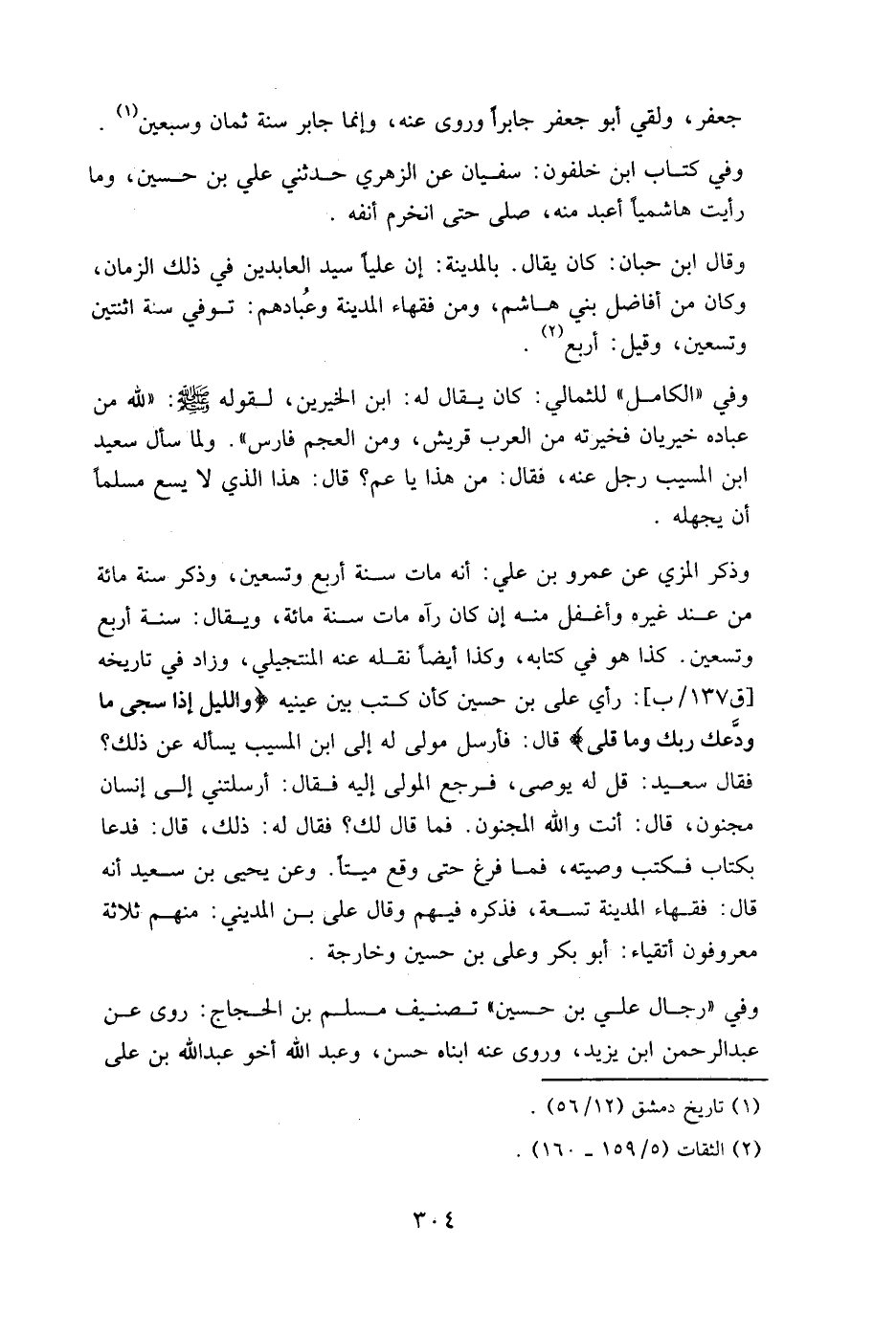 وفي كتاب ابن خلفون: سفيان عن الزهري حدثني علي بن حسين، وما رأيت هاشميا أعبد منه، صلى حتى انخرم أنفه.