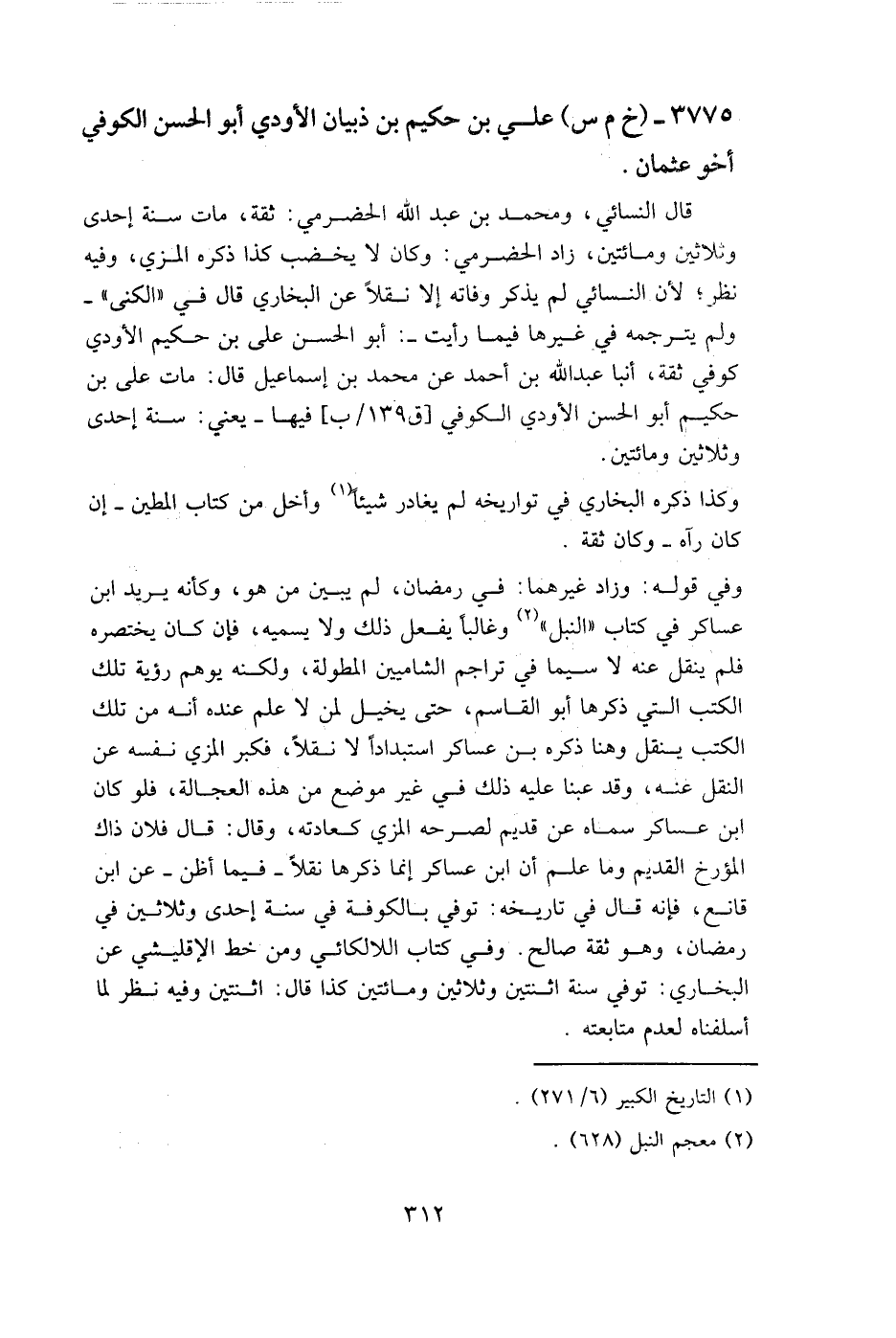 قال النسائي، ومحمد بن عبد الله الحضرمي: ثقة، مات سنة إحدى وثلاثين ومائتين، زاد الحضرمي: وكان لا يخضب، كذا ذكره المزي وفيه نظر؛ لأن النسائي لم يذكر وفاته إلا نقلا عن البخاري قال في "الكنى " - ولم يترجمه في غيرها فيما رأيت -: أبو الحسن علي بن حكيم الأودي كوفي ثقة، أنبأ عبد الله بن أحمد، عن محمد بن إسماعيل قال: مات علي بن حكيم أبو الحسن الأودي الكوفي [ق 139/ب] فيها - يعني: سنة إحدى وثلاثين ومائتين.