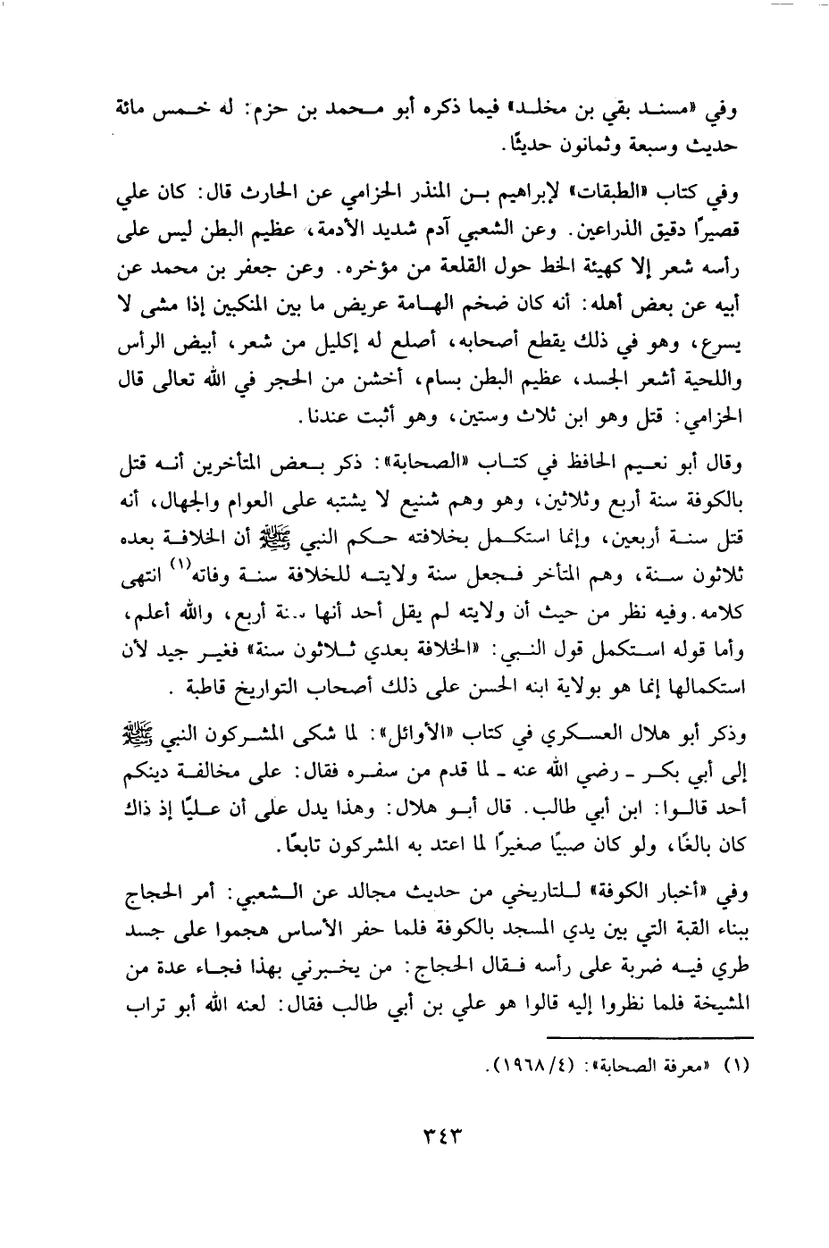 وقال أبو نعيم الحافظ في كتاب "الصحابة ": ذكر بعض المتأخرين أنه قتل بالكوفة سنة أربع وثلاثين، وهو وهم شنيع، لا يشتبه على العوام والجهال، أنه قتل سنة أربعين، وإنما استكمل بخلافته حكم النبي صَلى الله عَليه وسَلم أن الخلافة بعده ثلاثون سنة، وهم المتأخر فجعل سنة ولايته للخلافة سنة وفاته، انتهى كلامه، وفيه نظر من حيث أن ولايته لم يقل أحد أنها سنة أربع، والله أعلم، وأما قوله استكمل قول النبي: الخلافة بعدي ثلاثون سنة " فغير جيد؛ لأن استكمالها إنما هو بولاية ابنه الحسن على ذلك أصحاب التواريخ قاطبة.