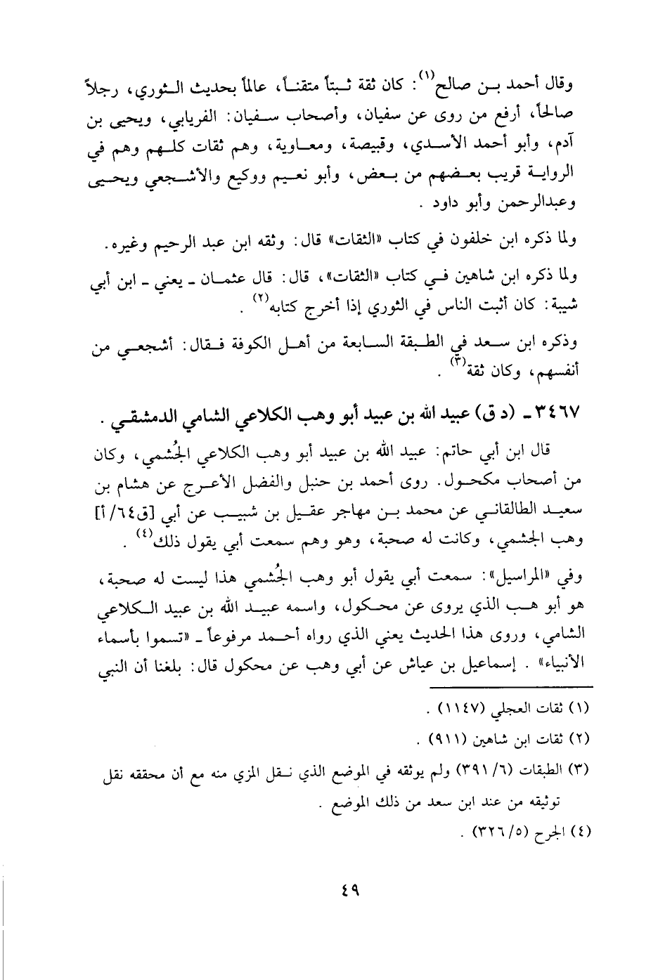 وفي "المراسيل ": سمعت أبي يقول أبو وهب الجشمي هذا ليست له صحبة، هو أبو وهب الذي يروي عن مكحول، واسمه عبيد الله بن عبيد الكلاعي الشامي، وروى هذا الحديث يعني الذي رواه أحمد مرفوعا " تسموا بأسماء الأنبياء. إسماعيل بن عياش عن أبي وهب عن مكحول قال: بلغنا أن النبي