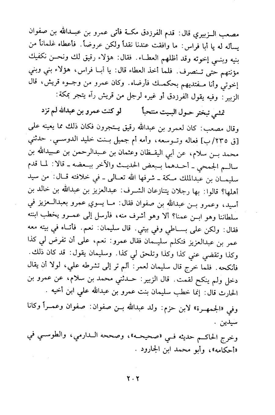 مصعب الزبيري قال: قدم الفرزدق مكة فأتى عَمرو بن عبد الله بن صفوان يسأله له يا أبا فراس: ما وافقت عندنا نقدًا ولكن عروضًا.