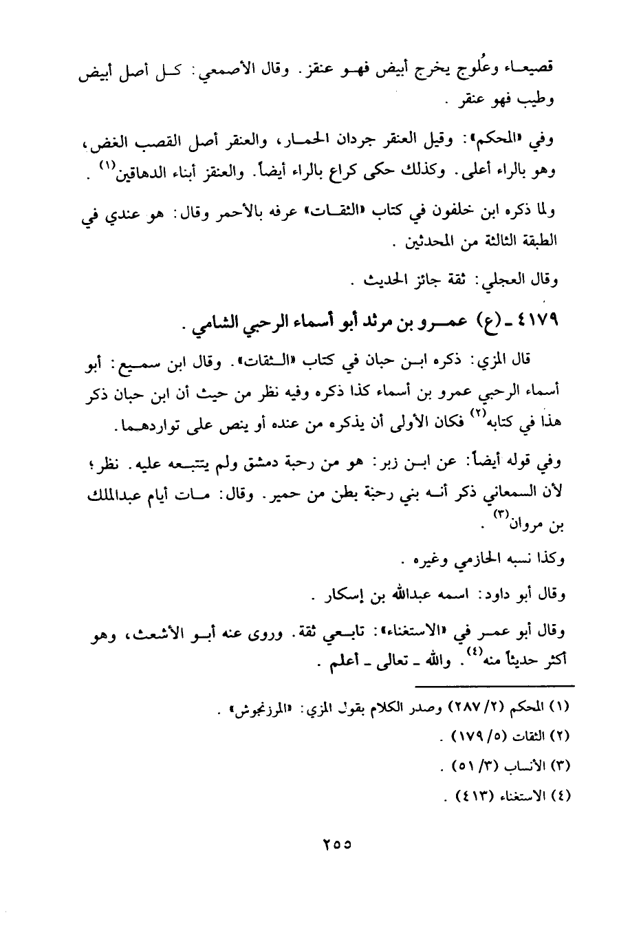 قال المزي: ذكره ابن حبان في كتاب "الثقات"، وقال ابن سميع: أبو أسماء الرحبي عَمرو بن أسماء، كذا ذكره وفيه نظر من حيث أن ابن حبان ذكر هذا في كتابه فكان الأولى أن يذكره من عنده أو ينص على تواردهما.