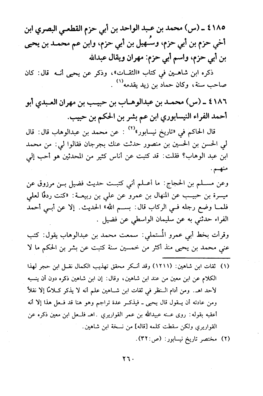4186- (س) محمد بن عبد الوهاب بن حبيب بن مهران العبدي أبو أحمد الفراء النيسابوري ابن عم بشر بن الحكم بن حبيب.