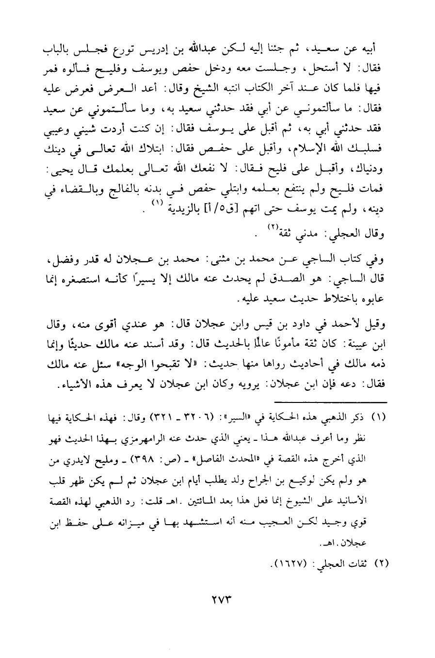 وقال ابن عيينة: كان ثقة مأمونًا عالمًا بالحديث. قال: وقد أسند عنه مالك حديثًا، وإنما ذمه مالك في أحاديث رواها؛ منها حديث: لا تقبحوا الوجه. سئل عنه مالك فقال: دعه فإن ابن عجلان يرويه، وكان ابن عجلان لا يعرف هذه الأشياء.