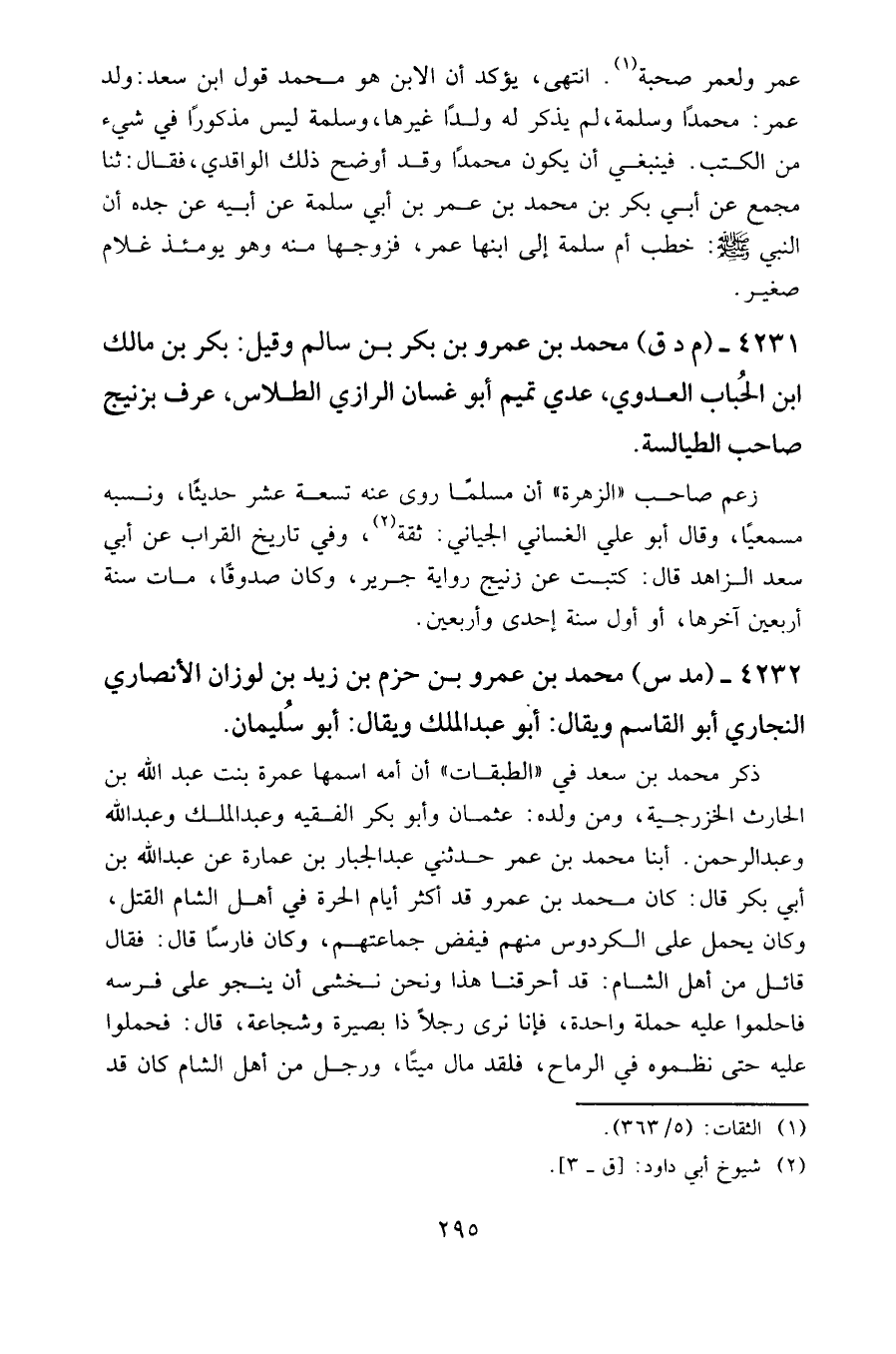 انتهى، يؤكد أن الابن هو محمد قول ابن سعد: ولد عمر: محمدًا وسلمة، لم يذكر له ولدًا غيرها، وسلمة ليس مذكورًا في شيء من الكتب.