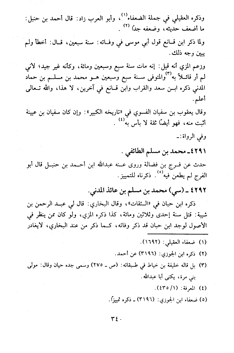 وذكره العقيلي في جملة الضعفاء، وأبو العرب زاد: قال أحمد بن حنبل: ما أضعف حديثه! وضعفه جدًّا.