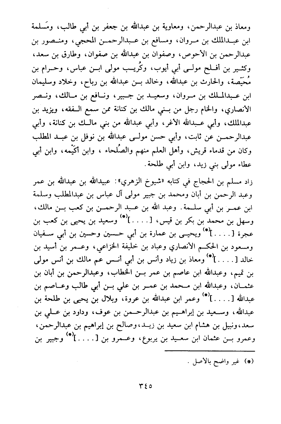 زاد مسلم بن الحجاج في كتابه " شيوخ الزهري ": عبيد الله بن عبد الله بن عمر وعبد الرحمن بن أبان ومحمد بن جبير مولى آل عباس بن عبد المطلب وسلمة بن عمر بن أبي سلمة، وعبد الله بن عبد الرحمن بن كعب بن مالك، وسهل بن محمد بن بكر بن قيس، [..] وسعيد بن يحيى بن كعب بن عجرة [....] ويحيى بن عمارة بن أبي حسين، وحسين بن أبي سفيان، ومسعود بن الحكم الأنصاري، وعباد بن خليفة الخزاعي، وعمر بن أسيد بن خالد [..] ومعاذ بن زياد وأنس بن أبي أنس عم مالك بن أنس مولى بن تميم، وعبد الله بن عاصم بن عمر بن الخطاب، وعبد الرحمن بن أبان بن عثمان، وعبد الله ابن محمد بن عمر بن علي بن أبي طالب وعاصم بن عبد الله [..] وعمر بن عبد الله بن عروة، وبلال بن يحيى بن طلحة بن عبد الله، وسعيد بن إبراهيم بن عبد الرحمن بن عوف، وداود بن علي بن سعد، ونبيل بن هشام بن سعيد بن زيد، وصالح بن إبراهيم بن عبد الرحمن، وعمرو بن عثمان ابن سعيد بن يربوع، وعمرو بن [..] وجبير بن
