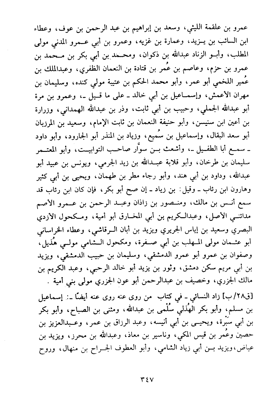 [ق 28/ب] زاد النسائي في كتاب من روى عنه روى عنه أيضًا: إسماعيل بن مسلم، وأبو بكر الهذلي سلمى بن عبد الله، ومثنى بن الصباح، وأبو بكر بن أبي سبرة، ويحيى بن أبي أنيسه، وعبد الرزاق بن عمر، وعبد العزيز بن حصين وعمر بن قيس المكي، وناسير بن معاذ، وعبد الله بن محرز، ويزيد بن عياض، ويزيد بن أبي زياد الشامي، وأبو العطوف الجراح بن منهال، وروح