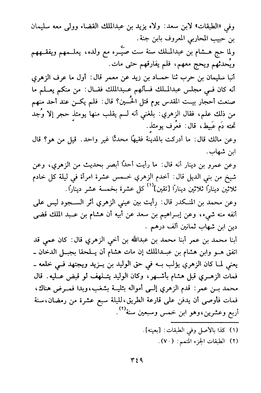 وعن محمد بن المنكدر قال: رأيت بين عيني الزهري أثر السجود ليس على أنفه منه شيء، وعن إبراهيم بن سعد عن أبيه أن هشام بن عبد الملك قضى دين ابن شهاب ثمانين ألف درهم.