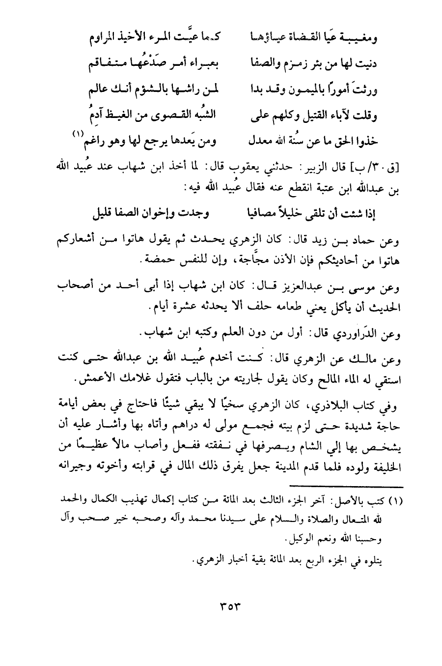 [ق 30/ب] قال الزبير: حدثني يعقوب قال: لما أخذ ابن شهاب عند عبيد الله بن عبد الله بن عتبة انقطع عنه؛ فقال عبيد الله فيه: