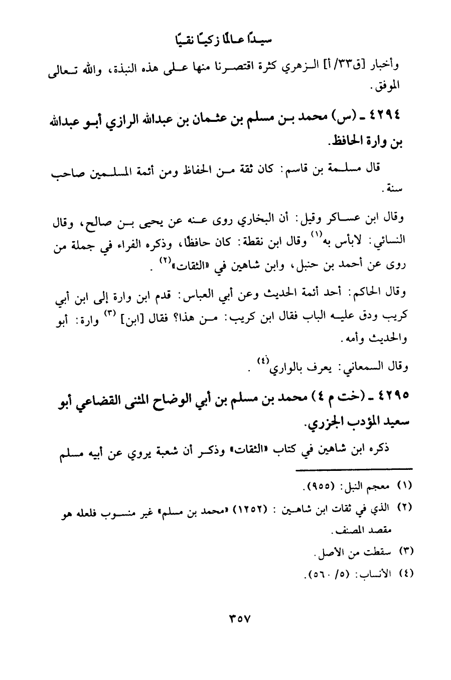 4294- (س) محمد بن مسلم بن عثمان بن عبد الله الرازي أبو عبد الله بن وارة الحافظ