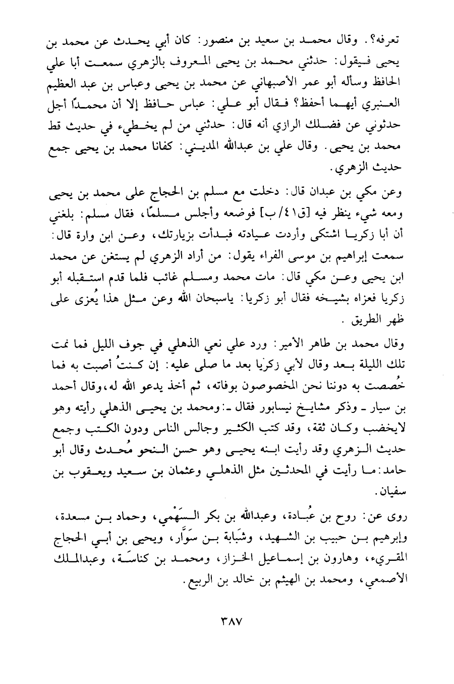 وعن مكي بن عبدان قال: دخلت مع مسلم بن الحجاج على محمد بن يحيى ومعه شيء ينظر فيه [ق 41/ب] فوضعه وأجلس مسلمًا، فقال مسلم: بلغني أن أبا زكريا اشتكى وأردت عيادته فبدأت بزيارتك، وعن ابن وارة قال: سمعت إبراهيم بن موسى الفراء يقول: من أراد الزهري لم يستغن عن محمد بن يحيى وعن مكي قال: مات محمد ومسلم غائب؛ فلما قدم استقبله أبو زكريا فعزاه بشيخه؛ فقال أبو زكريا: يا سبحان الله! وعن مثل هذا يعزى على ظهر الطريق.