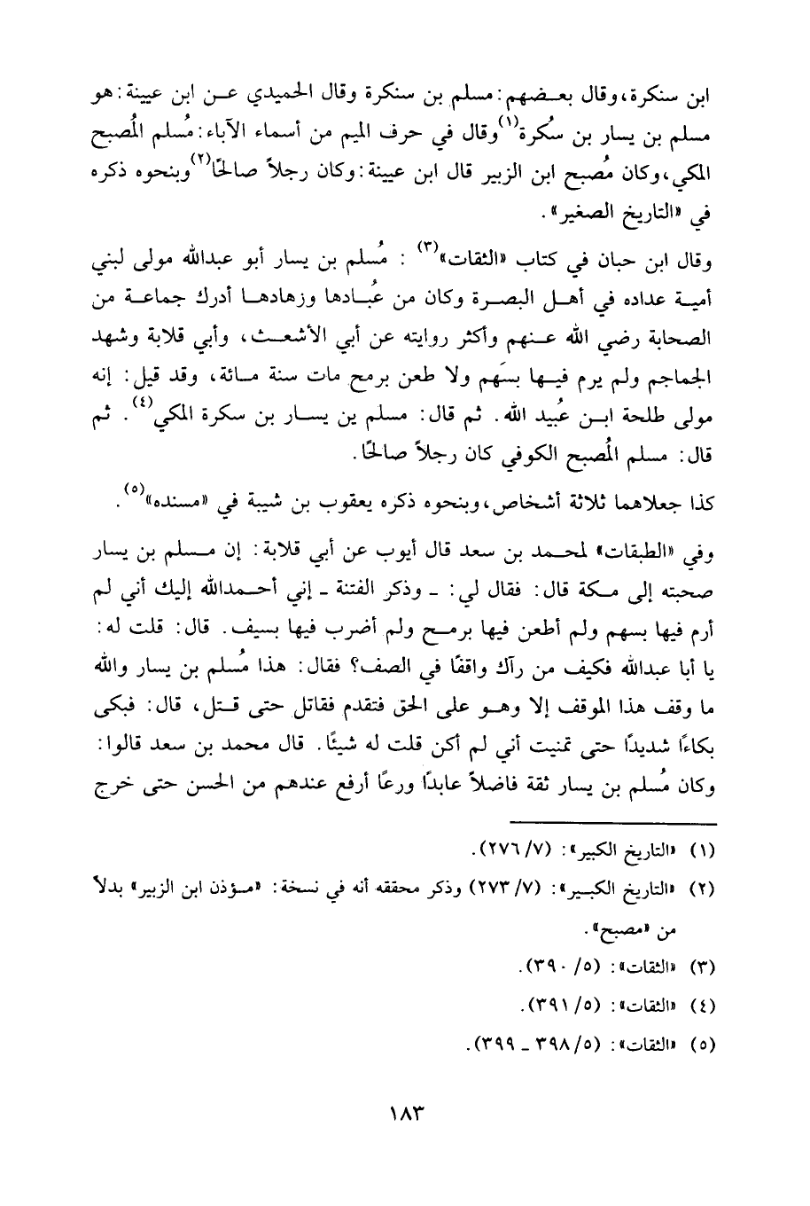 وقال ابن حبان في كتاب "الثقات": مسلم بن يسار، أبو عبد الله، مولى لبني أمية، عداده في أهل البصرة، وكان من عبادها وزهادها، أدرك جماعة من الصحابة رضي الله عنهم، وأكثر روايته عن أبي الأشعث وأبي قلابة، وشهد الجماجم، ولم يرم فيها بسهم ولا طعن برمح، مات سنة مِئَة، وقد قيل: إنه مولى طلحة ابن عبيد الله. ثم قال: مسلم بن يسار بن سكرة المكي. ثم قال: مسلم المصبح الكوفي، كان رجلا صالحا.