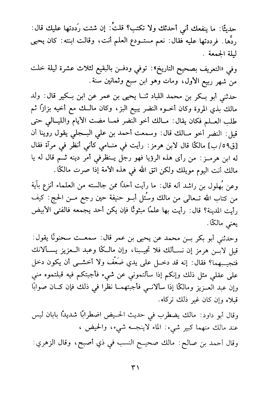 حديثا: ما ينفعك أني أحدثك ولا تكتب؟ قلت: إن شئت رددتها عليك، قال: ردها. فرددتها عليه، فقال: نعم مستودع العلم أنت، وقالت ابنته: كان يحيى ليلة الجمعة.