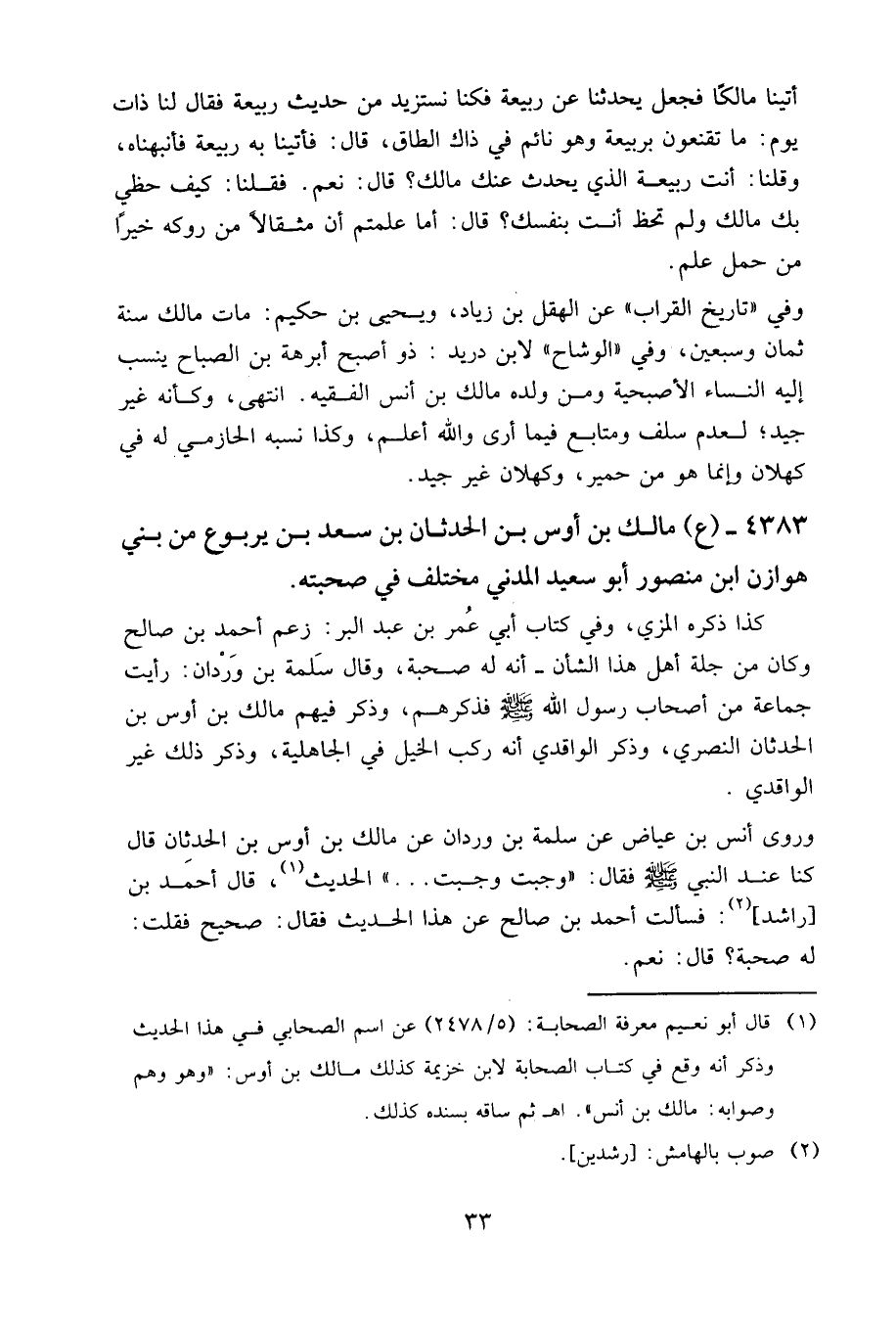 وروى أنس بن عياض، عن سلمة بن وردان، عن مالك بن أوس بن الحدثان قال: كنا عند النبي صلى الله عليه وسلم فقال: "وجبت، وجبت..." الحديث، قال أحمد بن راشد: فسألت أحمد بن صالح عن هذا الحديث فقال: صحيح، فقلت: له صحبة؟ قال: نعم.