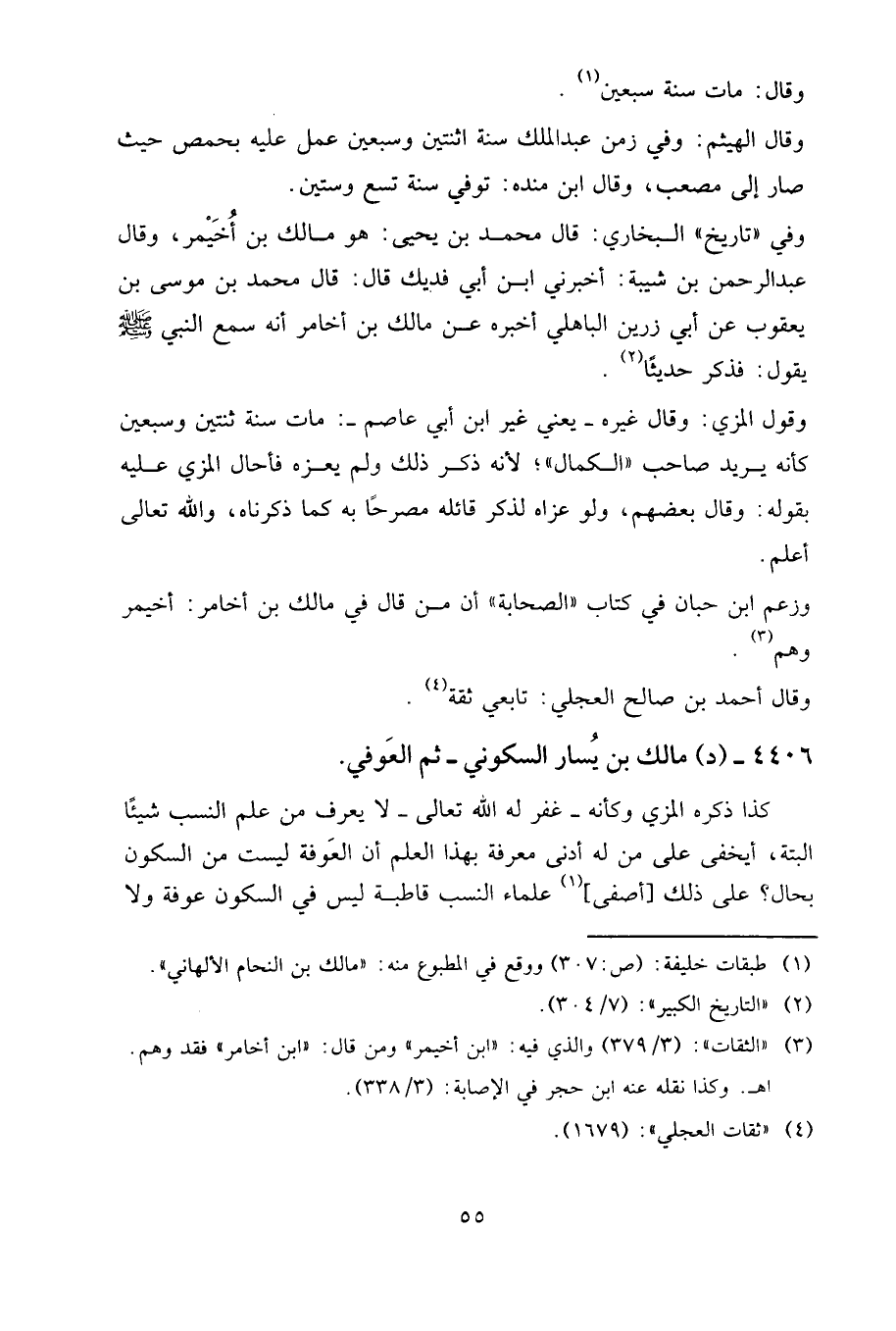كذا ذكره المزي وكأنه غفر له الله تعالى لا يعرف من علم النسب شيئا البتة، أيخفى على من له أدنى معرفة بهذا العلم أن العوفة ليست من السكون بحال؟ على ذلك أصفى علماء النسب قاطبة ليس في السكون عوفة ولا
