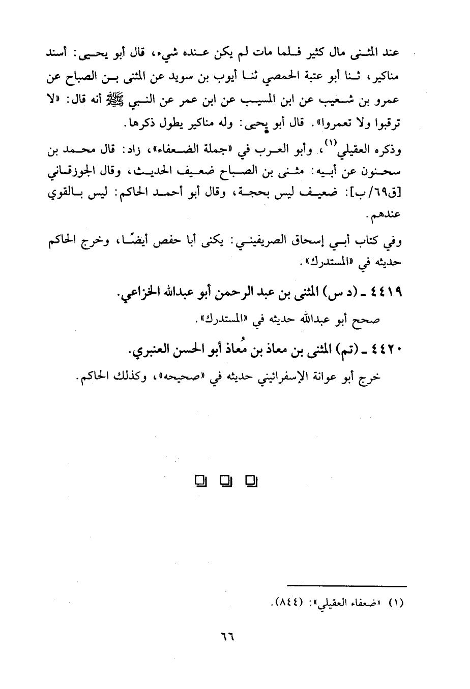 عند المثنى مال كثير، فلما مات لم يكن عنده شيء. قال أبو يحيى: أسند مناكير، حَدَّثنا أبو عتبة الحمصي، حَدَّثنا أيوب بن سويد، عن المثنى بن الصباح، عن عَمرو بن شعيب، عن ابن المسيب، عن ابن عمر، عن النبي صلى الله عليه وسلم أنه قال: "لا ترقبوا ولا تعمروا".