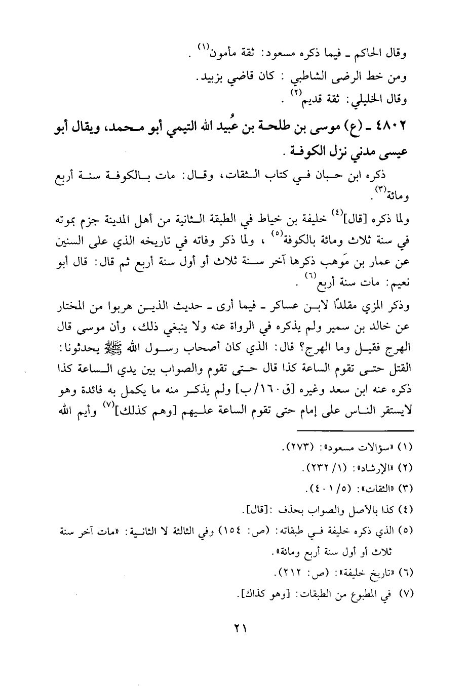 4802 - (ع) موسى بن طلحة بن عبيد الله التيمي، أبو محمد، ويقال: أبو عيسى، مدني، نزل الكوفة.