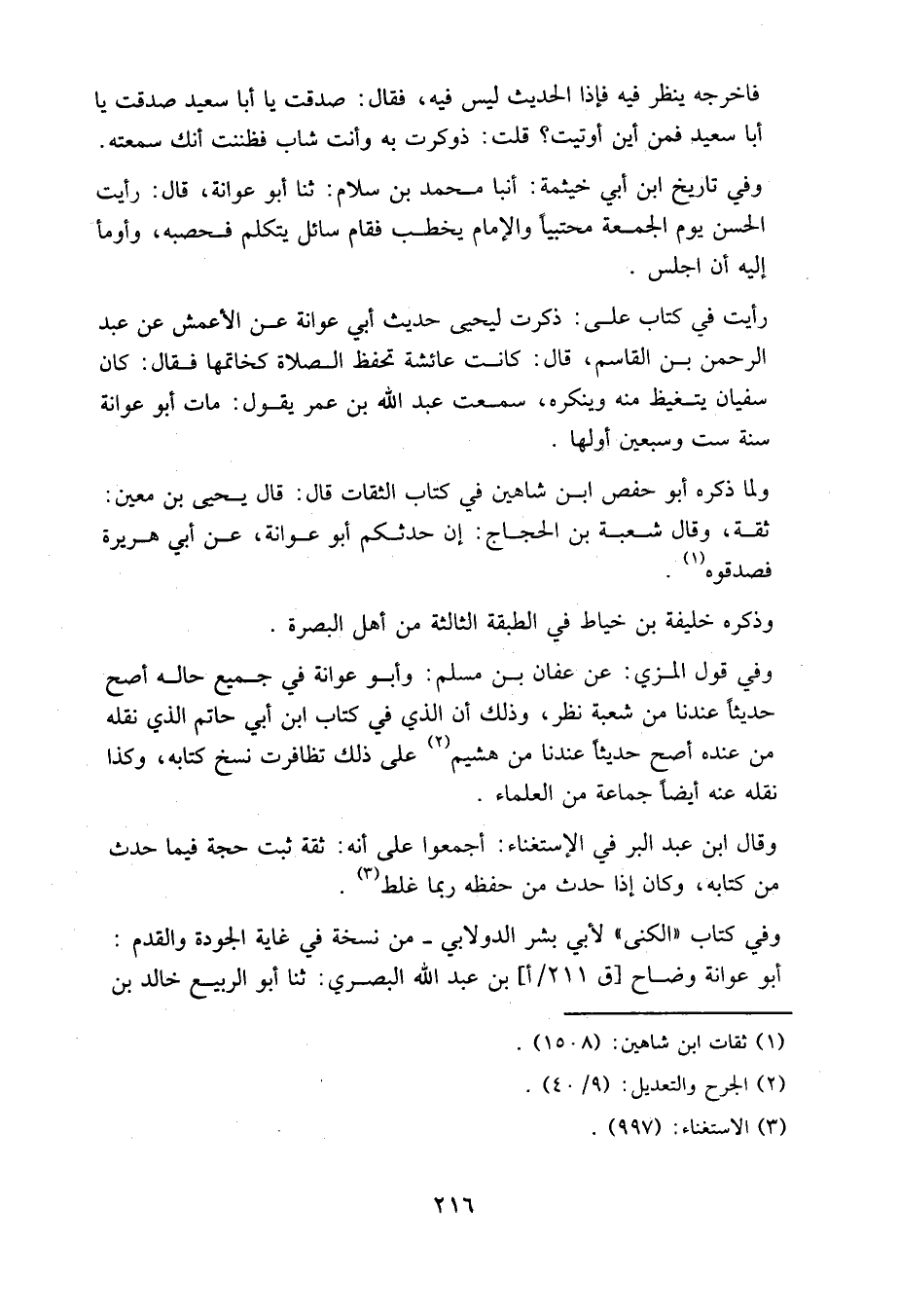 ولما ذكره أبو حفص ابن شاهين في كتاب "الثقات" قال: قال يحيى بن معين: ثقة، وقال شعبة بن الحجاج: إن حدثكم أبو عوانة عن أبي هريرة فصدقوه.
