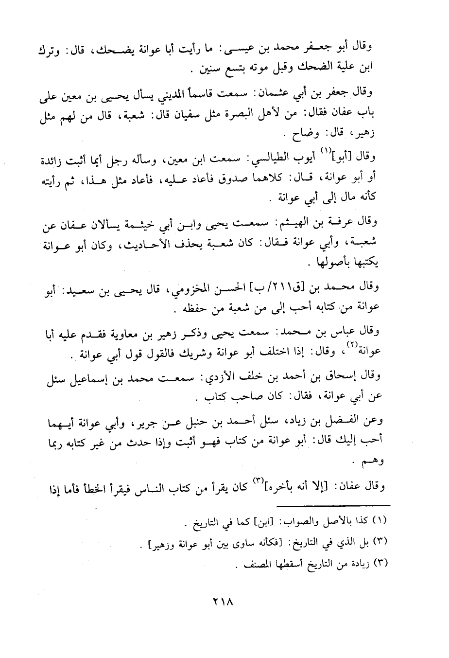وقال عرفة بن الهيثم: سمعت يحيى وابن أبي خيثمة يسألان عفان عن شعبة وأبي عوانة، فقال: كان شعبة يحذف الأحاديث، وكان أبو عوانة يكتبها بأصولها.