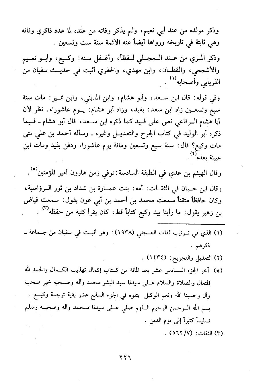 وفي قوله: قال ابن سعد، وأبو هشام، وابن المديني، وابن نمير: مات سنة سبع وتسعين، زاد ابن سعد: بفيد، وزاد أبو هشام: يوم عاشوراء نظر؛ لأن أبا هشام الرفاعي نص على فيد كما ذكره ابن سعد، قال أبو هشام فيما ذكره أبو الوليد في كتاب الجرح والتعديل وغيره وسأله أحمد بن علي: متى مات وكيع؟ قال: سنة سبع وتسعين ومِائَة يوم عاشوراء، ودفن بفيد، ومات ابن عيينة بعده.