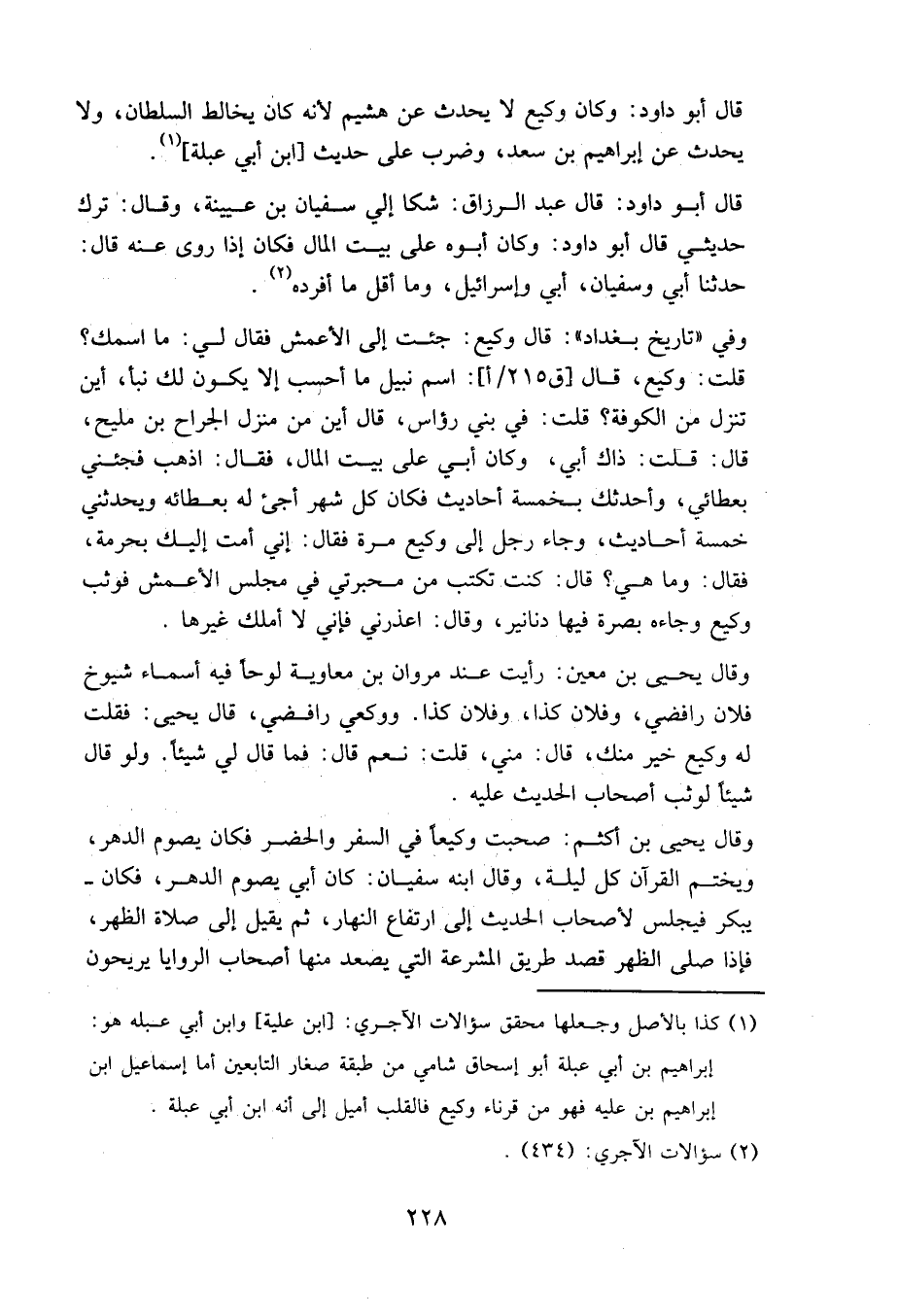 قال أبو داود: وكان وكيع لا يحدث عن هشيم؛ لأنه كان يخالط السلطان، ولا يحدث عن إبراهيم بن سعد، وضرب على حديث [ابن أبي عبلة].