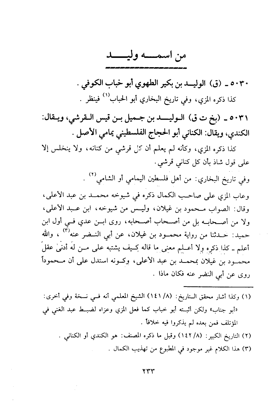 وعاب المزي على صاحب الكمال ذكره في شيوخه محمد بن عبد الأعلى، وقال: الصواب محمود بن غيلان، وليس من شيوخه ابن عبد الأعلى، ولا من أصحابه، بل من أصحاب أصحابه، روى ابن عدي في أول ابن حميد: حدثنا من رواية محمود بن غيلان، عن أبي النضر عنه، والله أعلم، كذا ذكره، ولا أعلم معنى ما قاله، كيف يشتبه على من له أدنى عقل محمود بن غيلان بمحمد بن عبد الأعلى، وكونه استدل على أن محمودا روى عن أبي النضر عنه، فكان ماذا؟.