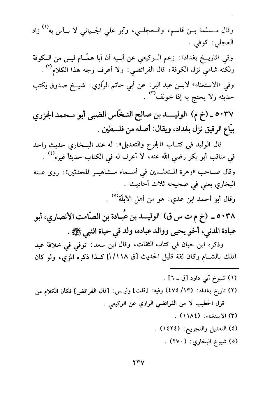 5037- (خ م) الوليد بن صالح النخاس الضبي، أبو محمد الجزري، بياع الرقيق، نزل بغداد، ويقال: أصله من فلسطين.