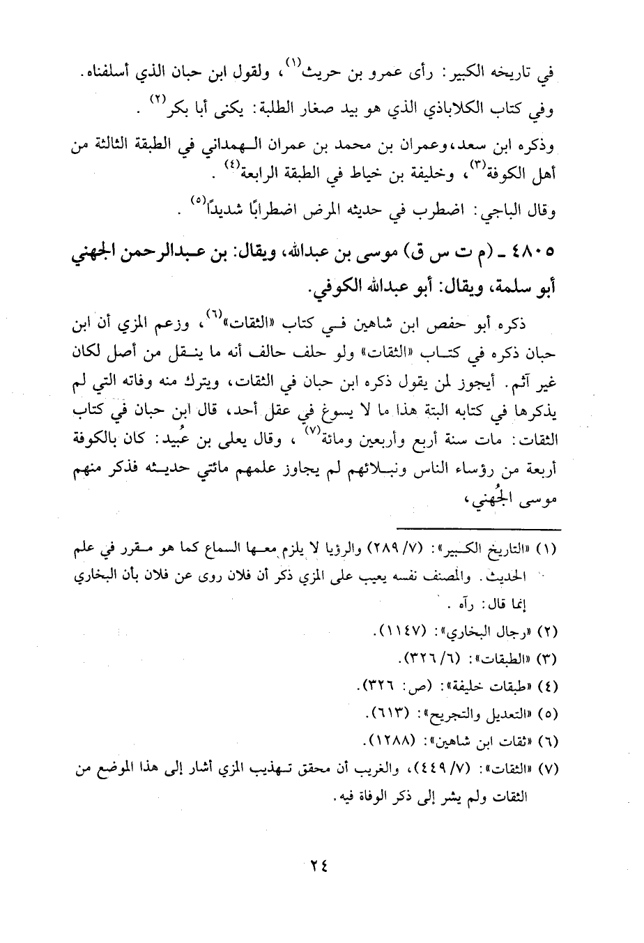 ذكره أبو حفص ابن شاهين في كتاب "الثقات"، وزعم المزي أن ابن حبان ذكره في كتاب "الثقات"، ولو حلف حالف أنه ما ينقل من أصل لكان غير آثم. أيجوز لمن يقول ذكره ابن حبان في الثقات، ويترك منه وفاته التي لم يذكرها في كتابه البتة؟! هذا ما لا يسوغ في عقل أحد.