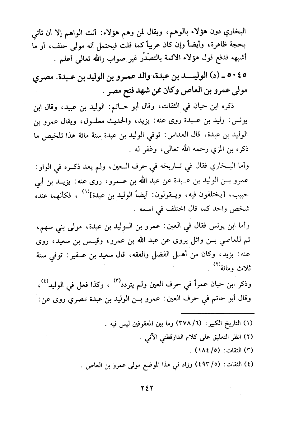 وأما البخاري فقال في تاريخه في حرف العين، ولم يعد ذكره في الواو: عَمرو بن الوليد بن عبدة، عن عبد الله بن عمرو، روى عنه: يزيد بن أبي حبيب [يختلفون فيه، ويقولون أيضا: الوليد بن عبدة]، فكأنهما عنده شخص واحد، كما قال: اختلف في اسمه.