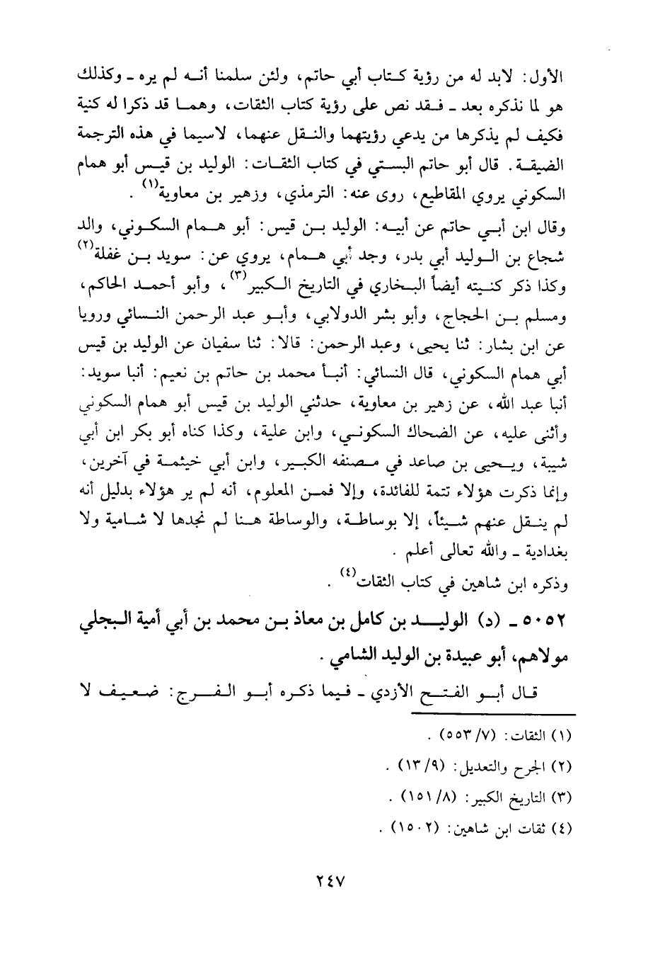 الأول: لابد له من رؤية كتاب أبي حاتم، ولئن سلمنا أنه لم يره وكذلك هو؛ لما نذكره بعد فقد نص على رؤية كتاب الثقات، وهما قد ذكرا له كنية، فكيف لم يذكرها من يدعي رؤيتهما والنقل عنهما، لاسيما في هذه الترجمة الضيقة؟