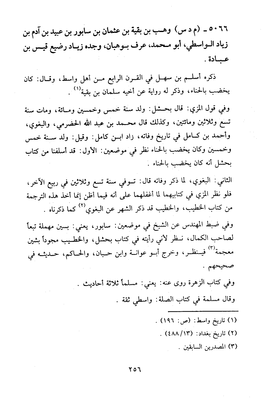 5066- (م د س) وهب بن بقية بن عثمان بن سابور بن عبيد بن آدم بن زياد الواسطي، أبو محمد، عرف بوهبان، وجده زياد، رضيع قيس بن عبادة.