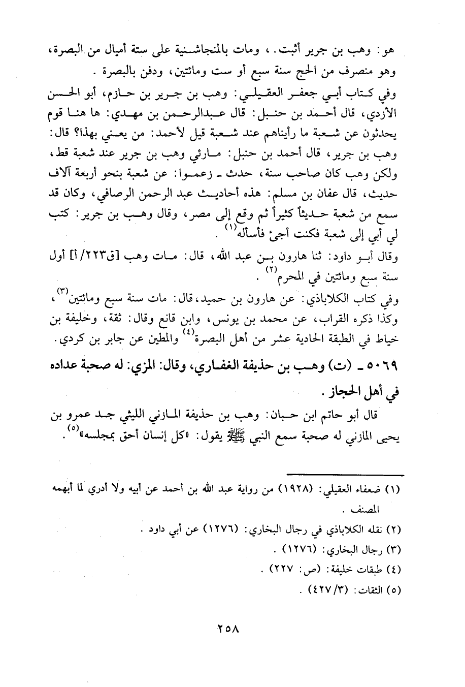 وفي كتاب أبي جعفر العقيلي: وهب بن جرير بن حازم، أبو الحسن الأزدي، قال أحمد بن حنبل: قال عبد الرحمن بن مهدي: هاهنا قوم يحدثون عن شعبة، ما رأيناهم عند شعبة، قيل لأحمد: من يعني بهذا؟ قال: وهب بن جرير، قال أحمد بن حنبل: ما رئي وهب بن جرير عند شعبة قط، ولكن وهب كان صاحب سنة، حدث زعموا عن شعبة بنحو أربعة آلاف حديث، قال عفان بن مسلم: هذه أحاديث عبد الرحمن الرصافي، وكان قد سمع من شعبة حديثا كثيرا، ثم وقع إلى مصر، وقال وهب بن جرير: كتب لي أبي إلى شعبة، فكنت أجيء فأسأله.