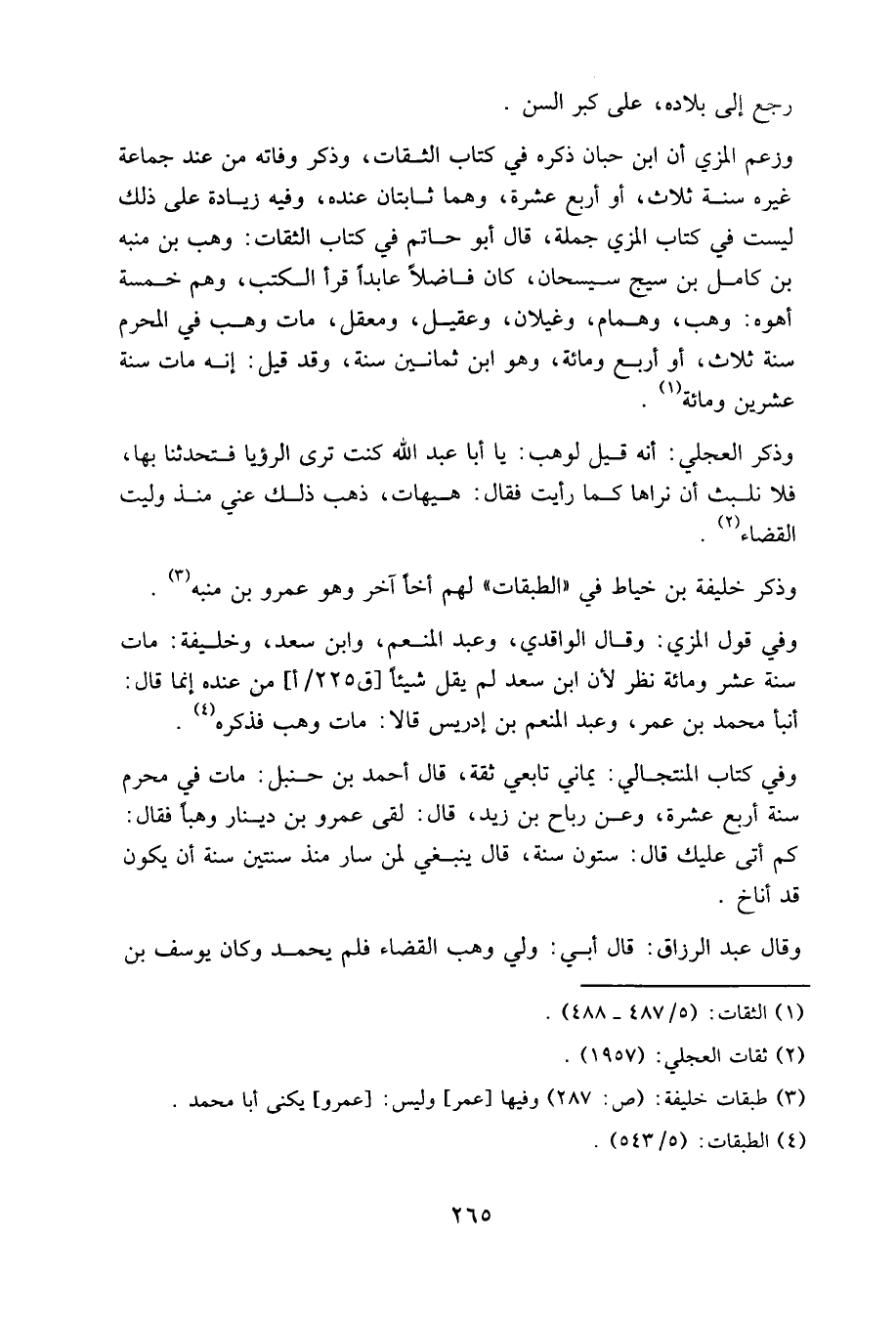 وفي كتاب المنتجالي: يماني تابعي ثقة، قال أحمد بن حنبل: مات في محرم سنة أربع عشرة، وعن رباح بن زيد، قال: لقي عَمرو بن دينار وهبا، فقال: كم أتى عليك؟ قال: ستون سنة، قال: ينبغي لمن سار منذ ستين سنة أن يكون قد أناخ.