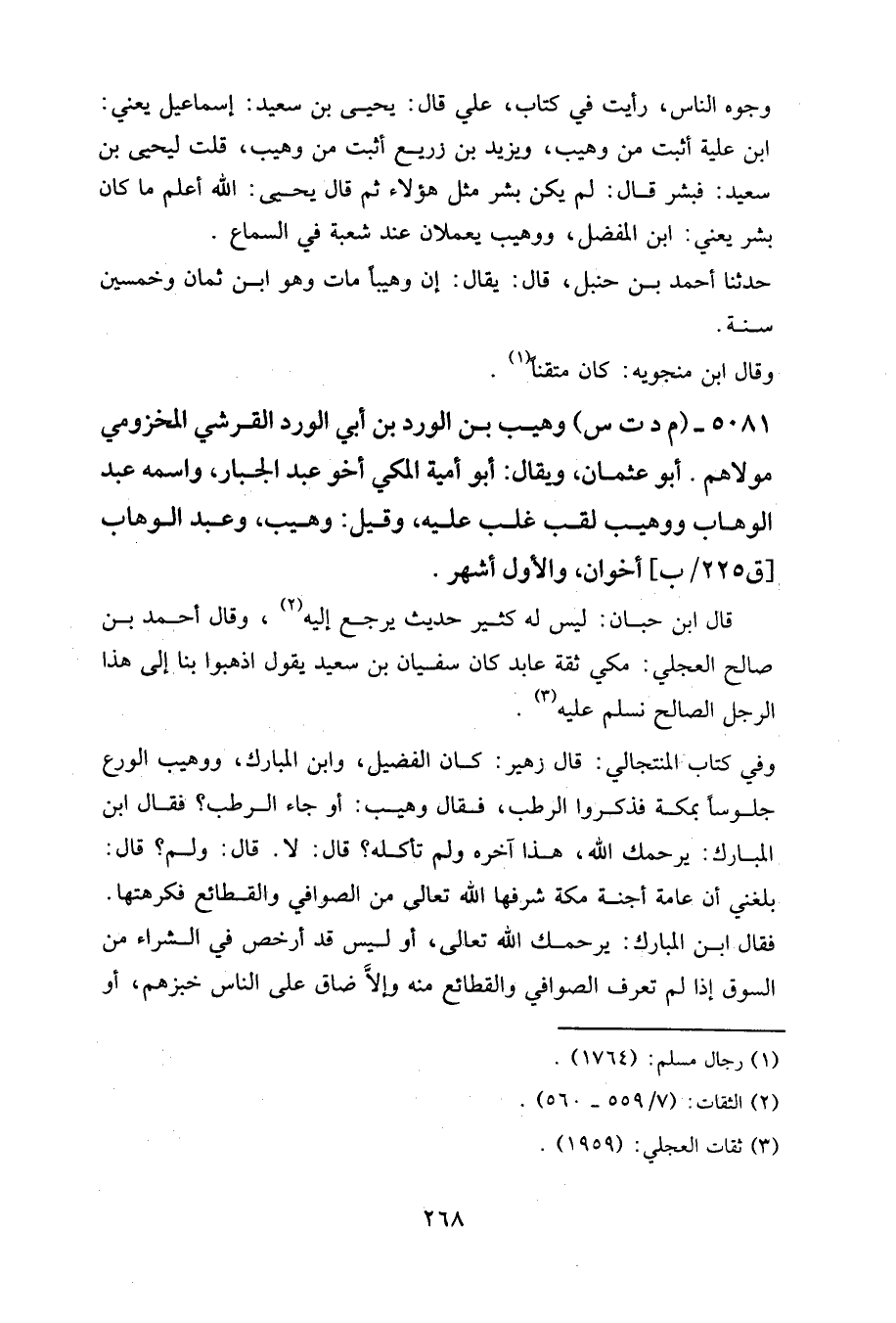 5081- (م د ت س) وهيب بن الورد بن أبي الورد القرشي المخزومي مولاهم. أبو عثمان، ويقال: أبو أمية المكي، أخو عبد الجبار، واسمه عبد الوهاب، ووهيب: لقب غلب عليه، وقيل: وهيب وعبد الوهاب [ق225/ب] أخوان، والأول أشهر.
